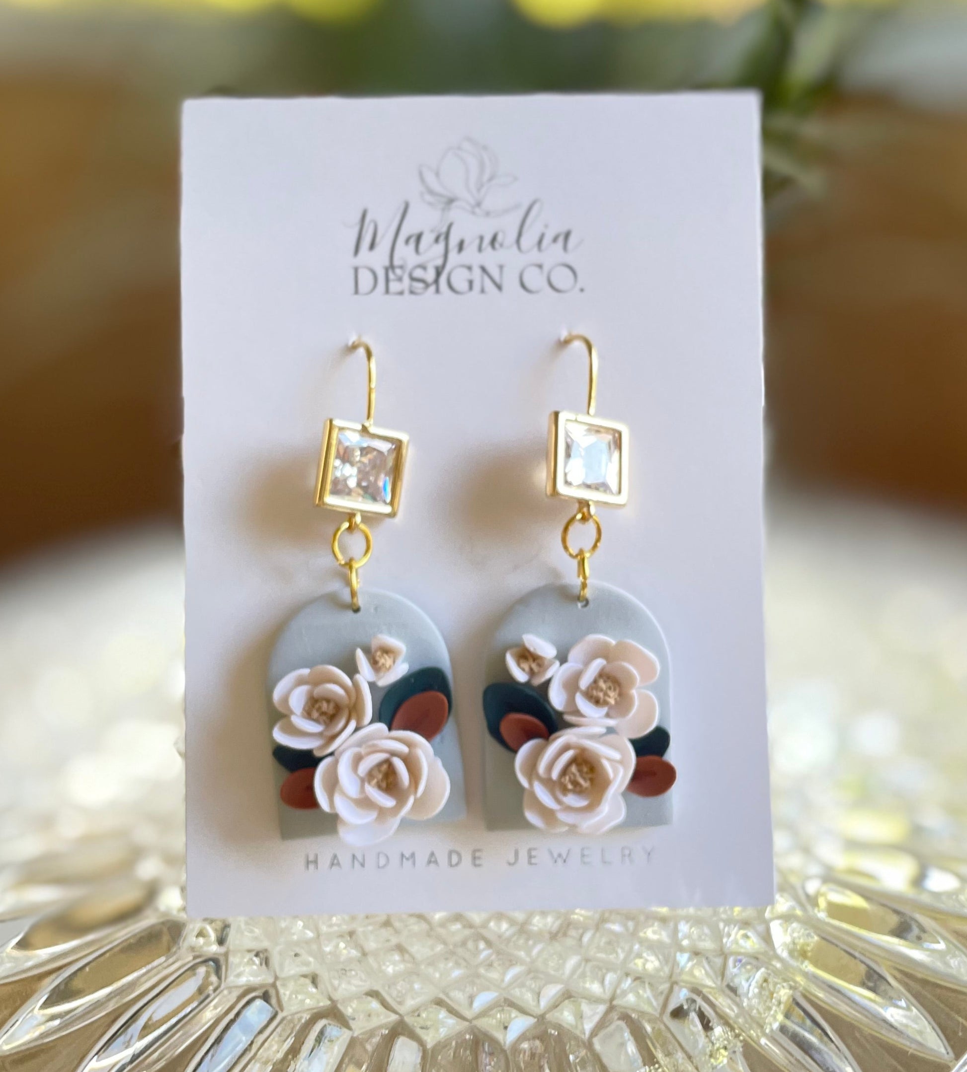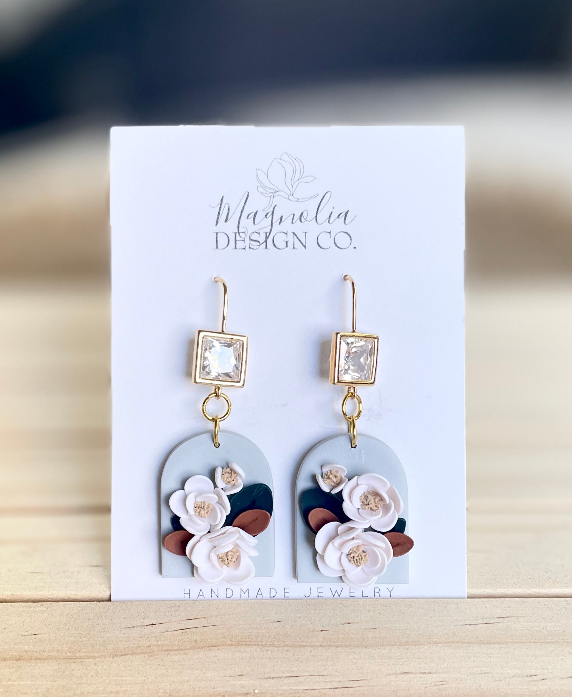 Part of our Heirloom Magnolia Collection, the Heirloom Magnolia Bloom is hand-assembled and adorned with sculpted magnolia blooms in soft ecru and beige, accented with chestnut and evergreen leaves. All flowers and leaves are handmade, each earring as unique as the person wearing them.